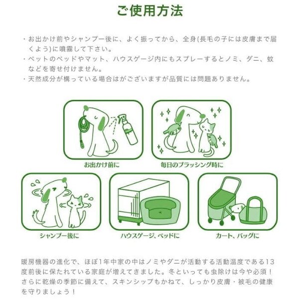 100%天然成分の虫よけ。ミネラル成分も豊富で皮膚を健やかに保ち、毛艶を良くしてくれます。成分のニームは「インドセンダン」という木から抽出された成分です。害虫の忌避効果だけでなく、豊富なミネラル成分を含んでいます。また、ケイ素をプラスしたことにより、静菌性、消炎鎮性、洗浄力、浸透性の効果があり、皮膚や被毛を守ります。