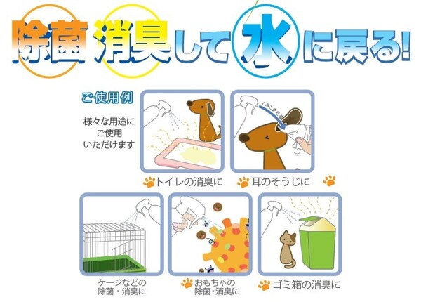 強力な除菌力・あらゆる菌類・ウィルス類に対する除菌効果があります。菌類:大腸菌・黄色ブドウ球菌・真菌・白癖菌・緑濃菌などウィルス類:インフルエンザ・ノロウィルス・単純ヘルペスなど強力な消臭力・臭いの発生源である腐敗菌を除菌することで、あらゆる悪臭を無臭化します。例)生ゴミ・タバコ・靴・衣服・動物臭・糞便・アンモニアなど人に環境に安心。・除菌消臭後は水になるので、手肌にかかっても、空気中に噴霧しても安心です。排水も安全です。・pHは肌に優しい弱酸性(6.3)です。