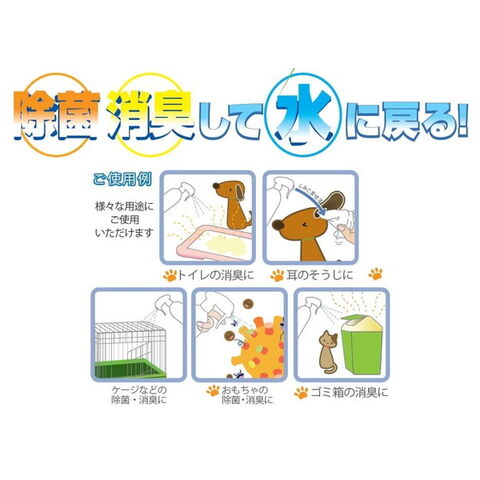 強力な除菌力・あらゆる菌類・ウィルス類に対する除菌効果があります。菌類:大腸菌・黄色ブドウ球菌・真菌・白癖菌・緑濃菌などウィルス類:インフルエンザ・ノロウィルス・単純ヘルペスなど強力な消臭力・臭いの発生源である腐敗菌を除菌することで、あらゆる悪臭を無臭化します。例)生ゴミ・タバコ・靴・衣服・動物臭・糞便・アンモニアなど人に環境に安心。・除菌消臭後は水になるので、手肌にかかっても、空気中に噴霧しても安心です。排水も安全です。・pHは肌に優しい弱酸性(6.1)です。