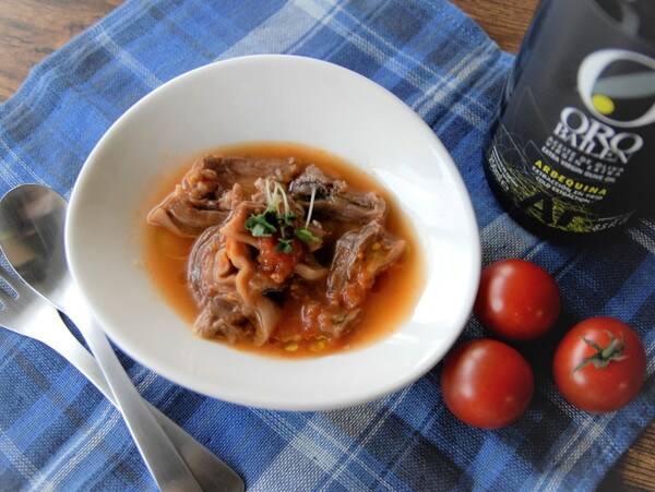 兵庫県播磨で採れた新鮮完熟プチトマトを使用。完熟後収穫したトマトは甘さ抜群です。国産牛の首のすじ肉とフレッシュトマトを無加水加圧調理でじっくり煮込みました。甘みと旨味がたっぷりの、贅沢な一皿。