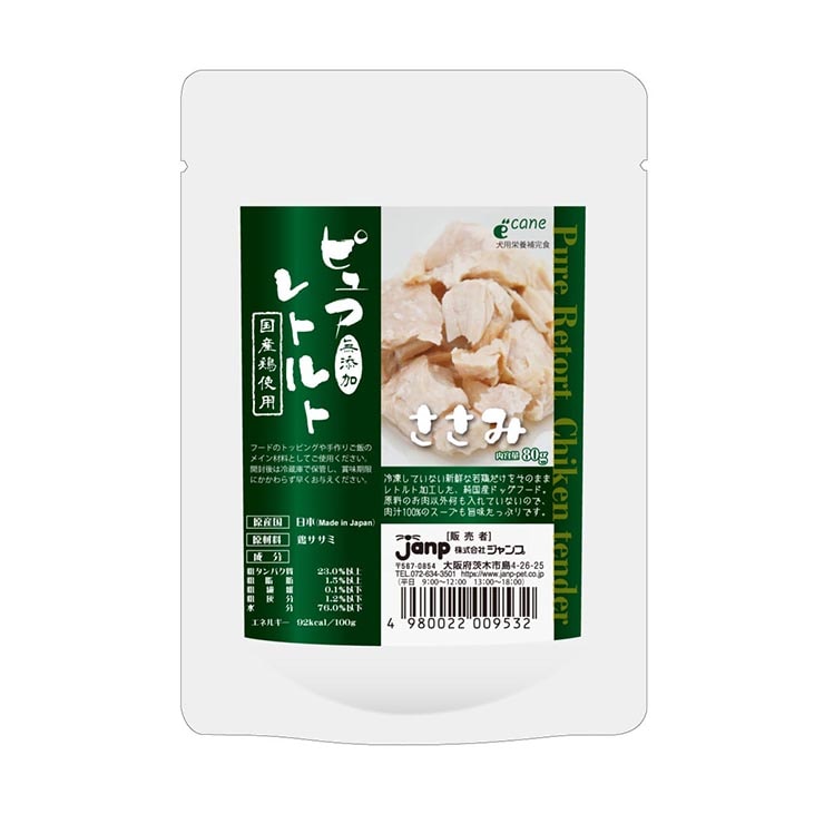 冷凍していない新鮮な若鶏のササミをそのままレトルト加工した、純国産ドッグフード。原料のお肉以外何も入れていないので、肉汁100%のスープも旨味たっぷりです。