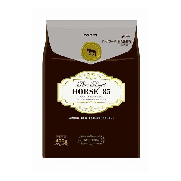 希少な馬肉をふんだんに(85%)使用した特別なピュアロイヤル。馬肉は高タンパク・低カロリーで、良質なビタミンミネラルが豊富な健康食材です。