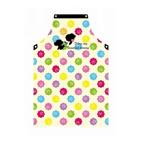 丈夫で耐久性の良いPVC(ポリ塩化ビニール)にプリントをした防水タイプのトリミングエプロン。裏面は張り付きにくいPU(ポリウレタン)素材となっています。素材を薄くすることにより、以前のタイプより柔らかく付け心地が良くなりました。周囲の縫製が無いので、自由に長さをカットすることが出来ます。