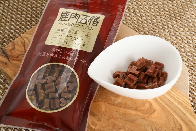 鹿肉(国産)、乾燥マッシュポテト、ソルビトール、澱粉分解物、澱粉、グリセリ ン、カゼインナトリウム、高麗人参、霊芝、ローヤルゼリー、かき殻、ハトムギ、鹿の角、まむし、魚骨、ローズ マリー抽出物、保存料(ソルビン酸カリウム)、リン酸ナトリウム