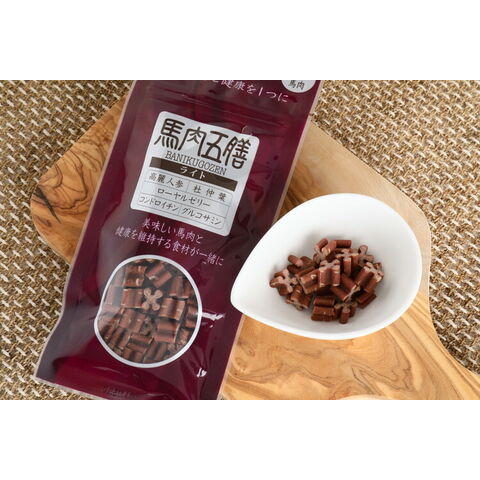 馬肉、おから、ソルビトール、澱粉分解物、澱粉、グリセリン、カゼインナトリウム、 高麗人参、杜仲葉、ローヤルゼリー、コンドロイチン、グルコサミン、霊芝、かき殻、ハトムギ、鹿の角、まむ し、魚骨、ローズマリー抽出物、保存料(ソルビン酸カリウム)、リン酸ナトリウム