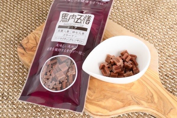 馬肉、乾燥マッシュポテト、ソルビトール、澱粉分解物、澱粉、グリセリン、カゼイ ンナトリウム、高麗人参、田七人参、霊芝、コラーゲンペプチド、ローヤルゼリー、コンドロイチン、グルコ サミン、かき殻、ハトムギ、鹿の角、まむし、魚骨、ローズマリー抽出物、保存料(ソルビン酸カリウム)、リ ン酸ナトリウム、酸化防止剤(ビタミンC、ビタミンE)