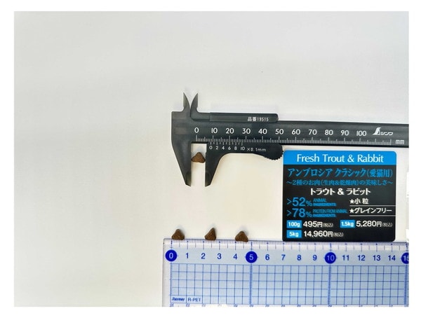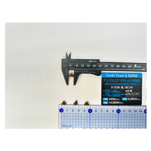 トラウト(30%)、ドライラビット(21%)、ドライポテトフレーク、エンドウ豆、割ったエンドウ豆、ポテトタンパク、ビートパルプ、リグノセルロース、ビール酵母、加水分解酵母、サーモンオイル(1%)、ドライチコリ(FOSとイヌリンの供給源として)、ドライアップル、ドライ人参、DL-メチオニン、塩化コリン、タウリン、ドライブロッコリー、ドライほうれん草、ドライトマト、ドライクランベリー、ドライブルーベリー、ビタミンE(一部保存料として)、L-カルニチン、塩酸グルコサミン(100mg/kg)、コンドロイチン硫酸塩(100mg/kg)、亜鉛、ドライハーブ(ユッカシジゲラ、ローズマリー、ウコン、シトラス、ユーゲニア)、ビタミンB12、ビオチン、ナイアシン、パントテン酸、マンガン、ビタミンA、ビタミンB2、銅、ビタミンB1、ビタミンB6、ヨウ素、葉酸、セレン、ビタミンD3