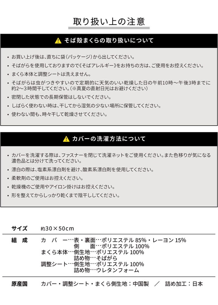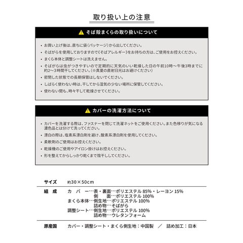 そばアレルギーの方はご使用いただけません。ご使用の際は通気性の良い場所に保管いただき、定期的に天日干しをお願いいたします。