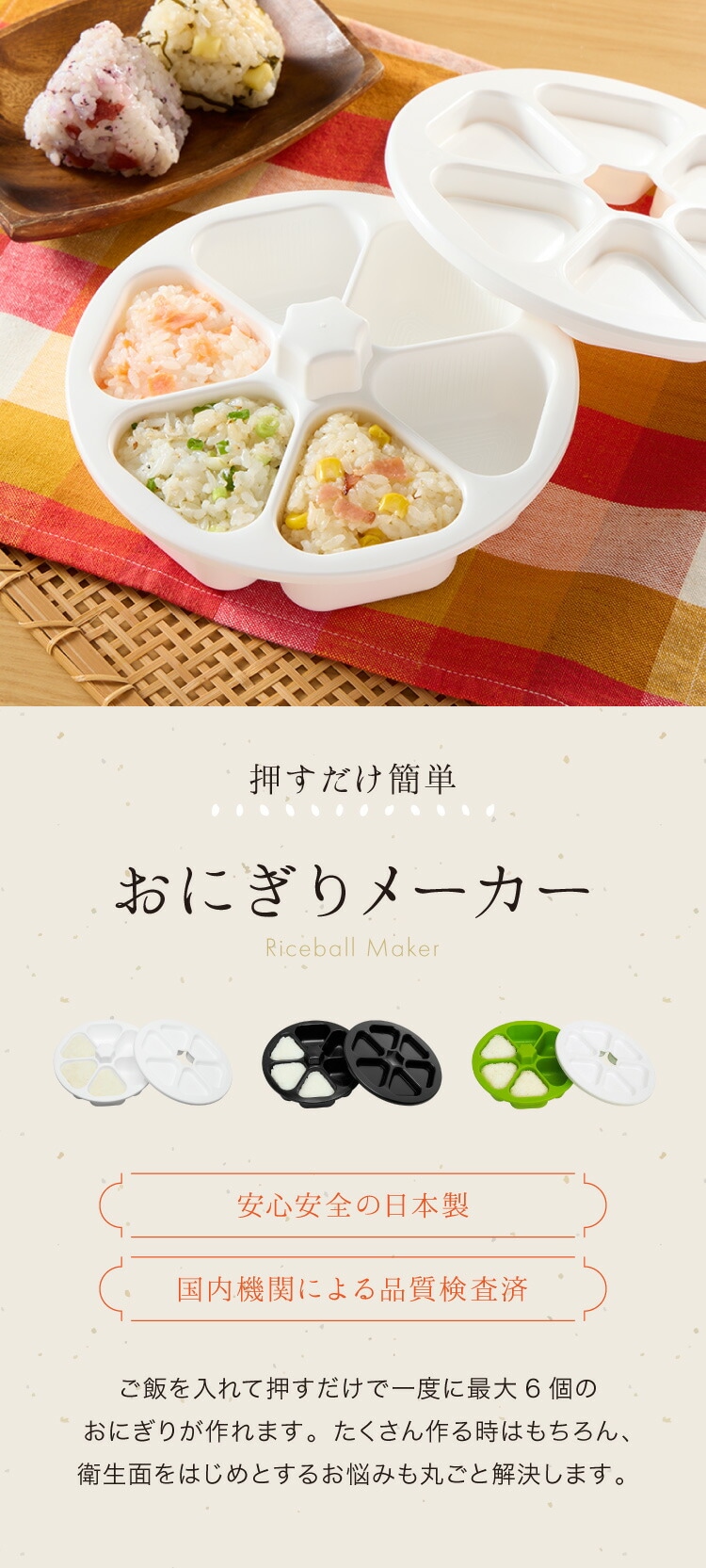 日本製 おにぎり型 6個まとめて! おにぎりメーカー 6個 同時 おにぎり 型 メーカー おむすび お弁当作りに 三角 押し型 抜き型 ぬき型 型抜き 白 ホワイト 黒 ブラック ライスボールメーカー【送料無料】