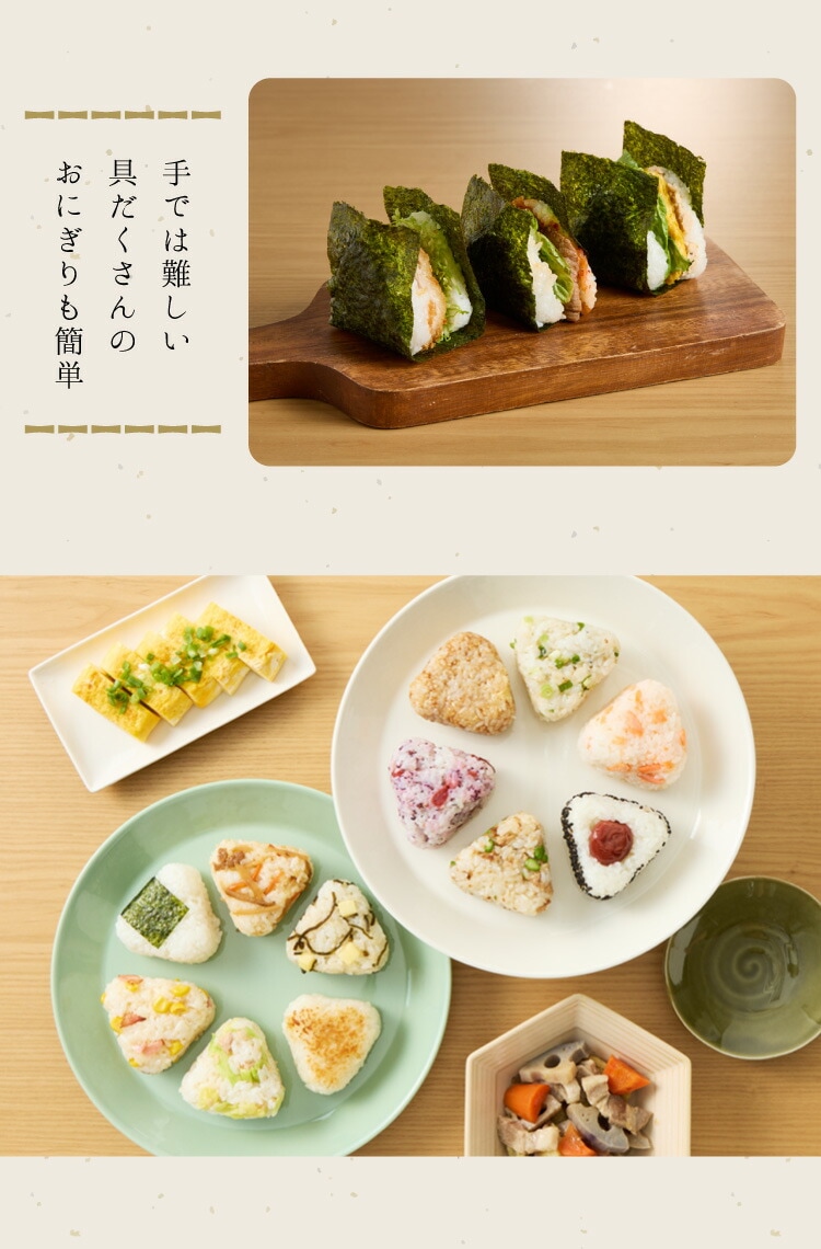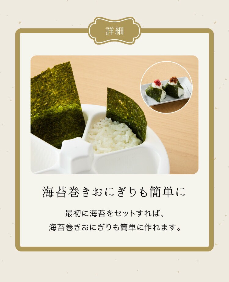 海苔をセットして作ると、手を汚さずに海苔巻きおにぎりが作れます。