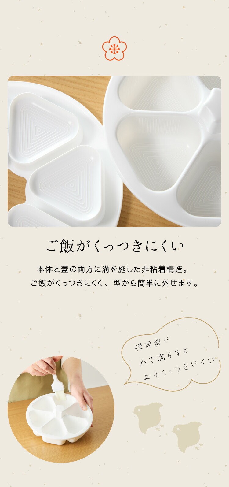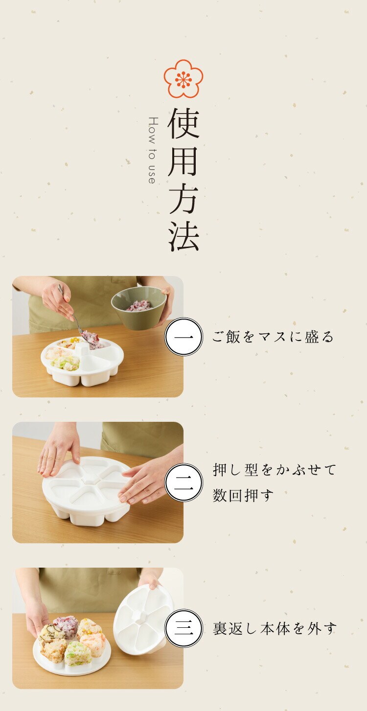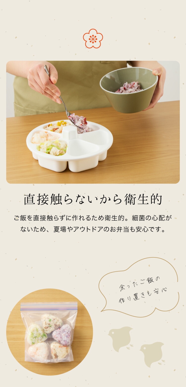 本体にご飯を入れてギュッと押すだけ!おにぎりに直接触れずに作れるので衛生的です。