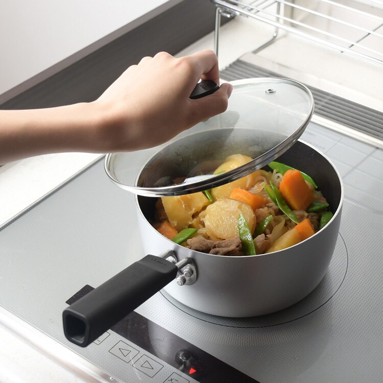 材質:本体/ステンレス鋼(クロム14%)はり底/アルミニウム合金 ステンレス鋼(クロム11%) 取っ手/フェノール樹脂 蓋/強化ガラス製器具(強化の種類/全面物理強化)