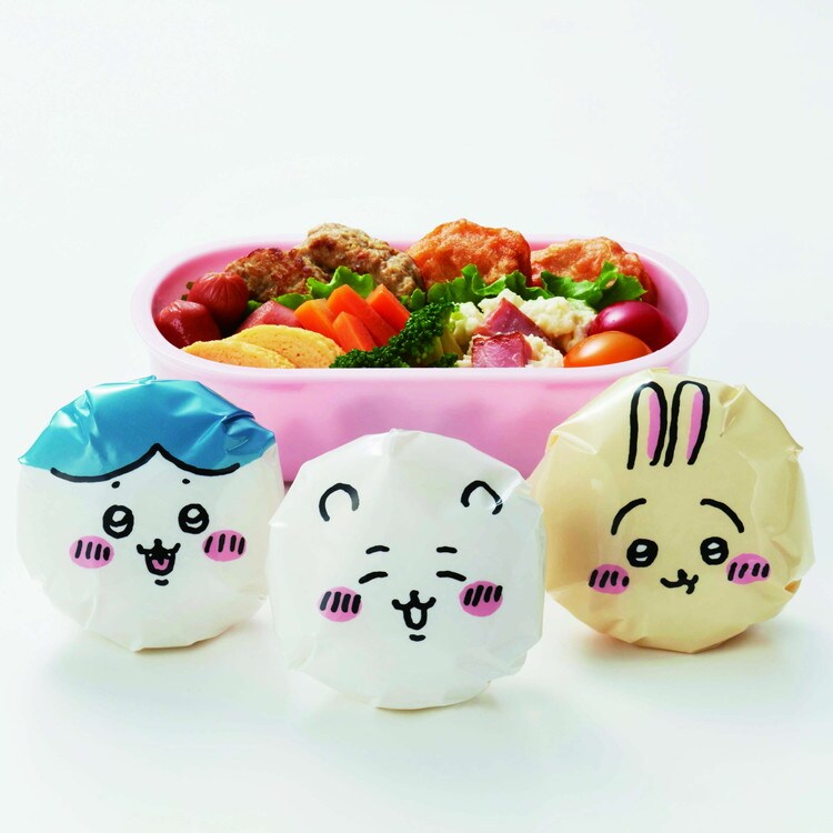 ラップにご飯やお好みの具材を入れて、くるっと包んでシール止めすると、ちいかわの顔のおにぎりの出来上がり。お子さまも楽しんで作ることが出来ます。包み紙を結ぶ、とめシール付き。