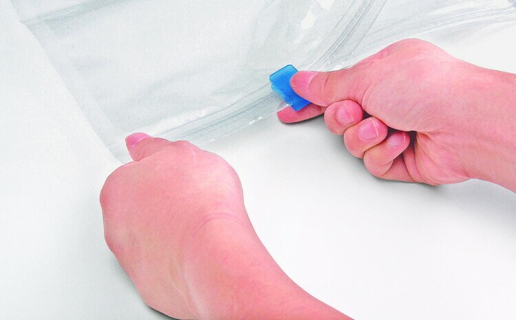 奥行きが長いタイプの収納ケース(奥行約74cm)に2個並べて収納できる。空気が漏れにくい2重チャック構造にスライダーが取り付けてあるので、収納が楽。