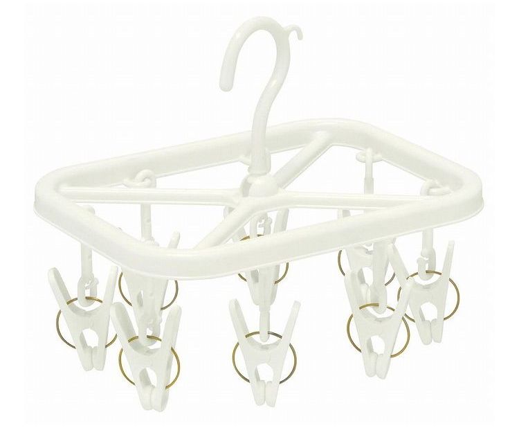 オフホワイトのボディが、部屋干しをしていても目立たない。吊りひもから洗濯ばさみのリングが外せるので、破損したり紛失した洗濯ばさみは市販のものと取り替えられる。ランジェリー用などお好みのピンチに交換することも。