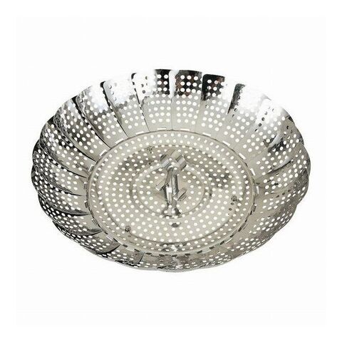 手持ちの鍋で手軽に蒸し料理が楽しめる、伸縮するステンレス製の蒸し目皿。茶碗蒸しや温野菜、ふかしイモ、中華まん、シューマイ、赤飯などに。18cmから28cmまでの鍋やフライパンに対応可能。大きなものを蒸す場合、中のつまみは簡単に取り外せる。