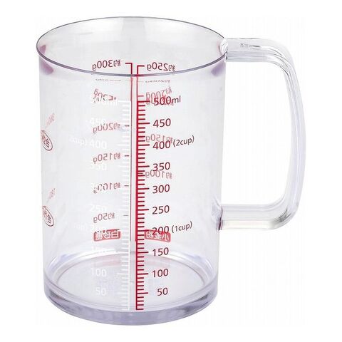 縁が外側に開いた形状で、どこから注いでも液だれしにくい計量カップ。500mlまでの目盛り付き。赤い目盛と、醤油なども測りやすい白い目盛付き。