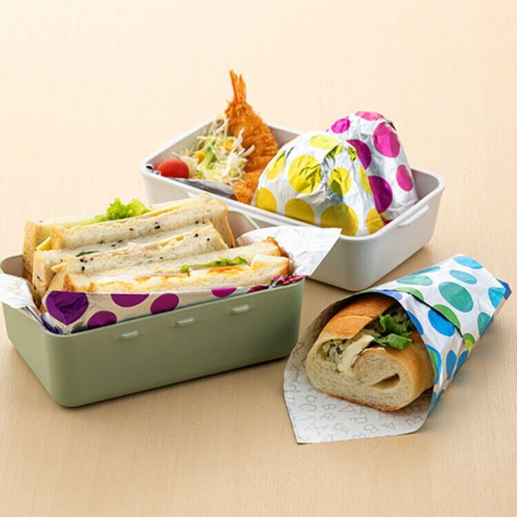 吸湿紙+アルミの二層構造でべちゃつかないパサつかない。おにぎり用アルミホイル。おにぎりだけでなく、サンドイッチを包んだり、ランチボックスに敷いたりもできる。