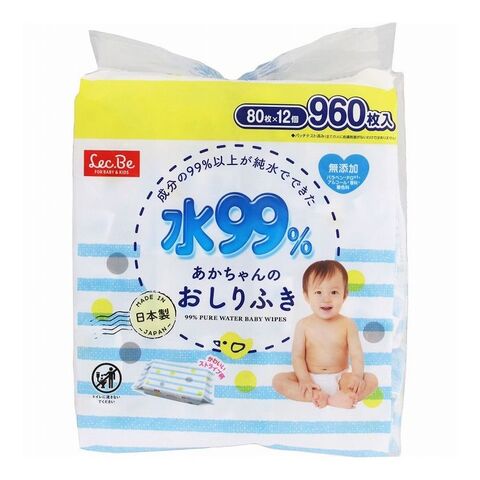 成分の99%以上が純水でできたあかちゃんのおしりふき。80枚入りが12個入った増量パック。デリケートな赤ちゃんのおしりに優しいやわらかいシート。