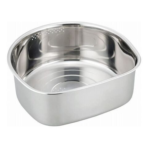 洗い桶を使えば節水にもなり経済的です。お皿などの平たい食器がぴったりくっつかない、凹凸のある底面形状。背面上部に排水用のパンチング穴つき。底面には、滑っていかないゴム足がついています。
