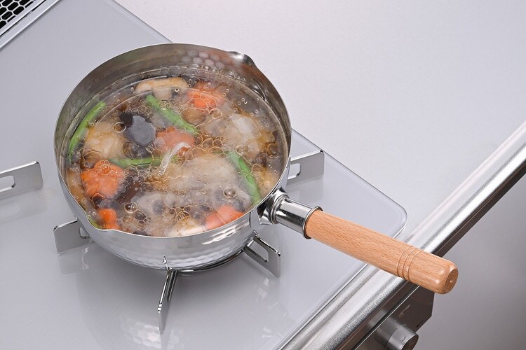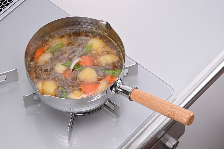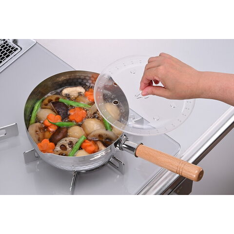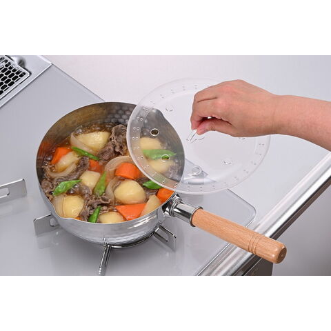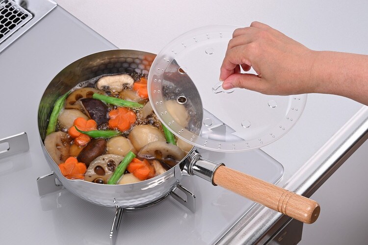 ガラスのような高い透明度だから、蓋をしたまま火力調節の目安や味の染み込み具合など、中の具材を確認できる。プラスチックに比べて、耐熱性に優れ(耐熱180℃)、酸やアルカリにも強く、油汚れが落としやすい素材。軽くて割れにくく、熱にも強いので、食洗機にも対応。外周には灰汁を取りやすくするための細かい凹凸がついたシボ加工。