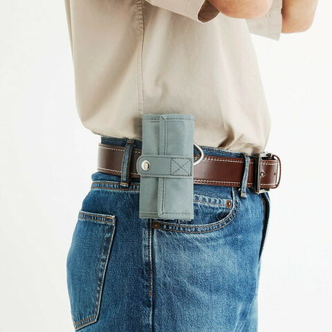 背面ベルトでベルトループに取り付け可能。カラビナ付き。