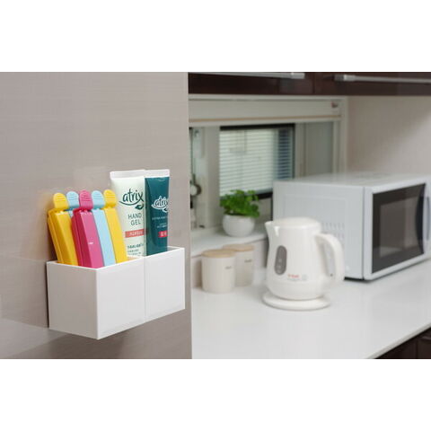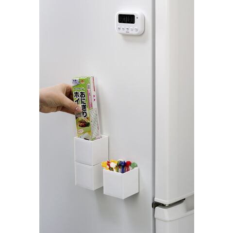 マグネットで壁面にくっつき、底板を外しても使えるキューブ型の小物入れ。約6cm四方のサイズ。