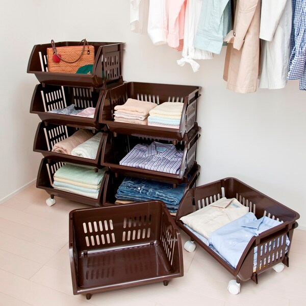 クローゼットでは、衣類やバッグ・帽子の収納にも便利です。積み重ねるだけでなく、横の連結もできる便利な「ツメ」がついているのでクローゼット下部のデッドスペースも有効利用できます。(1)積み重ねて使う時は、本体の底にある4か所のツメ部分を、下段の上部4か所の溝にそれぞれ下に向けて強く押し込んでください。(2)差し込んだ部分の側面を内側に向かって『パチッ』と音がするまで強く押し込んでください。