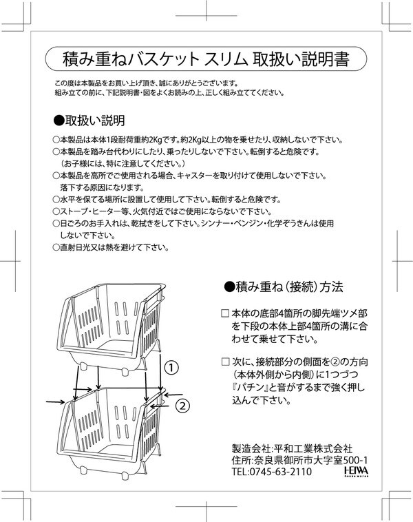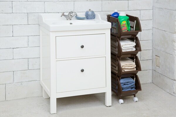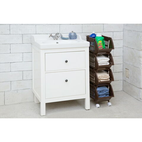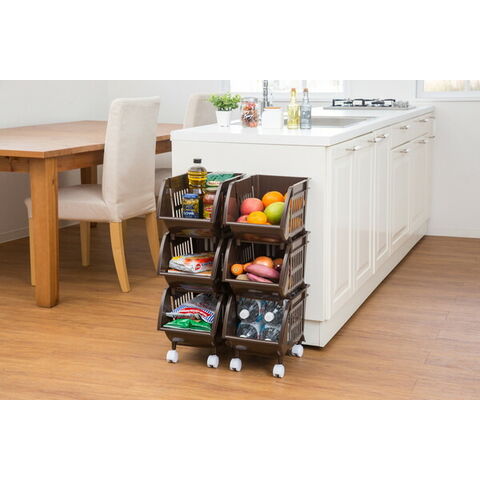 かんたんに積み重ねて使えるスリム型のバスケット。間口が広くて出し入れしやすい。積み重ねたままでも中身が出し入れできるので、とても使いやすい。さまざまなご家庭の小物、衣類、雑貨の整理・整頓にぴったり。別売りの「積み重ねバスケット専用キャスター」をつけて使えば、お掃除の際の移動もラク。