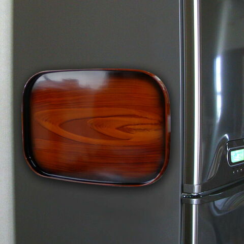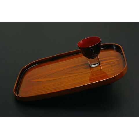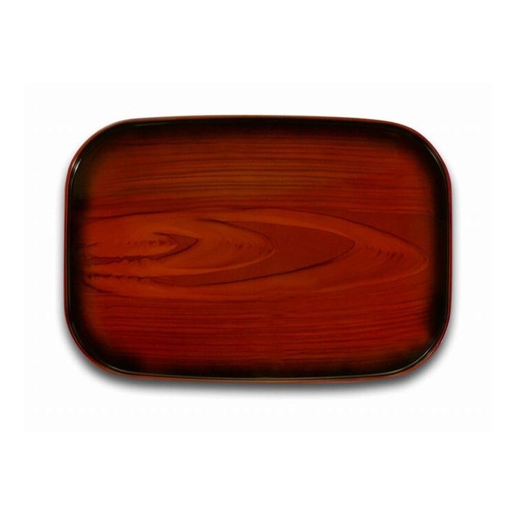 場所を取らず、お盆を収納するためのスタンド等も不要。木製トレーと比べ水に強く変形しにくく、扱いやすい。伝統的な木目調が高級感があり、ご家庭や職場での来客時にあると便利。木目の模様は、紀州漆器の塗り職人がひとつひとつ描いて塗り上げています。