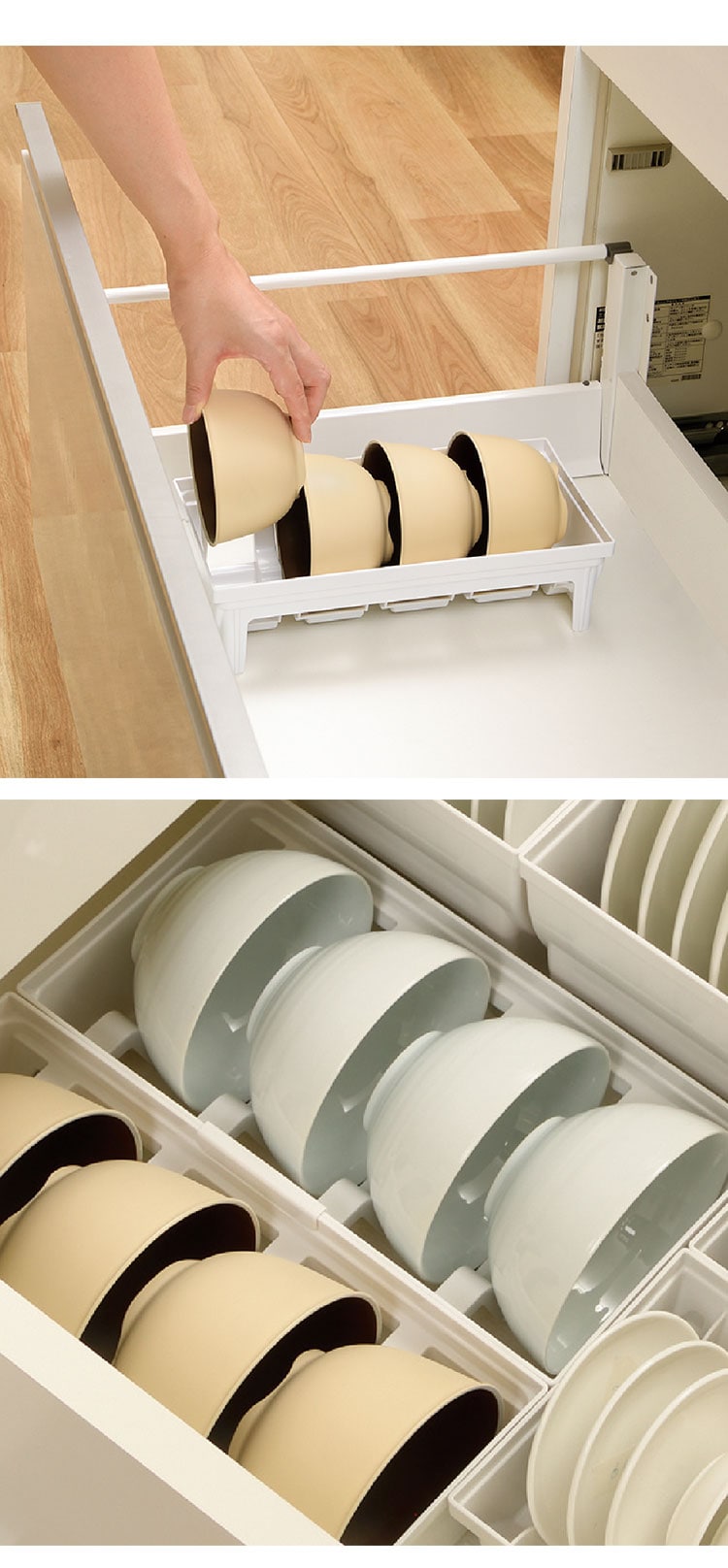 段差が付いているので、お椀の深さが違ってもまっすぐ立てて収納できます。