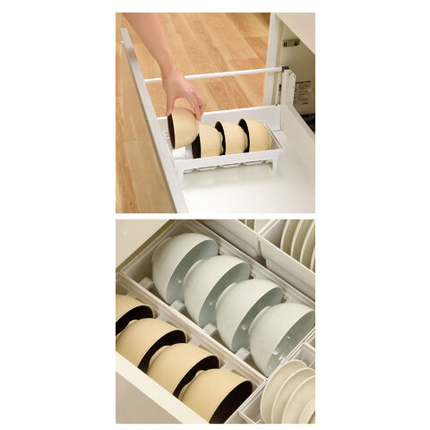 お椀を深引き出しに立てて収納することで見やすく、サッと取り出すことができます。