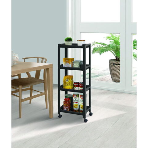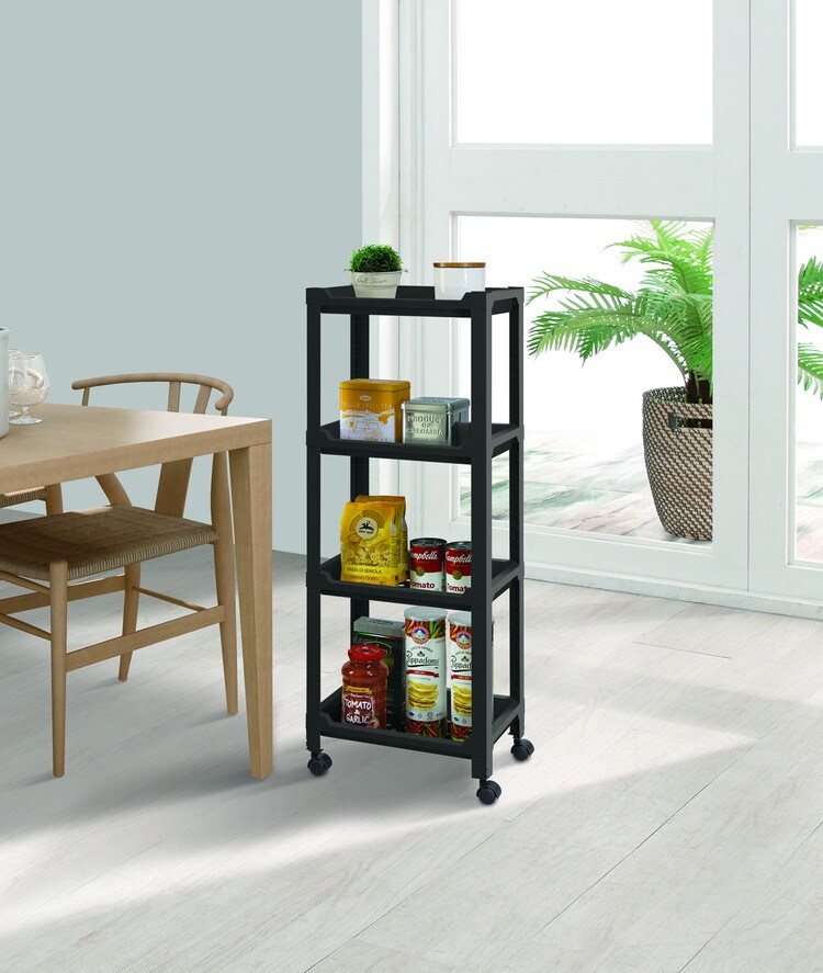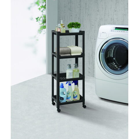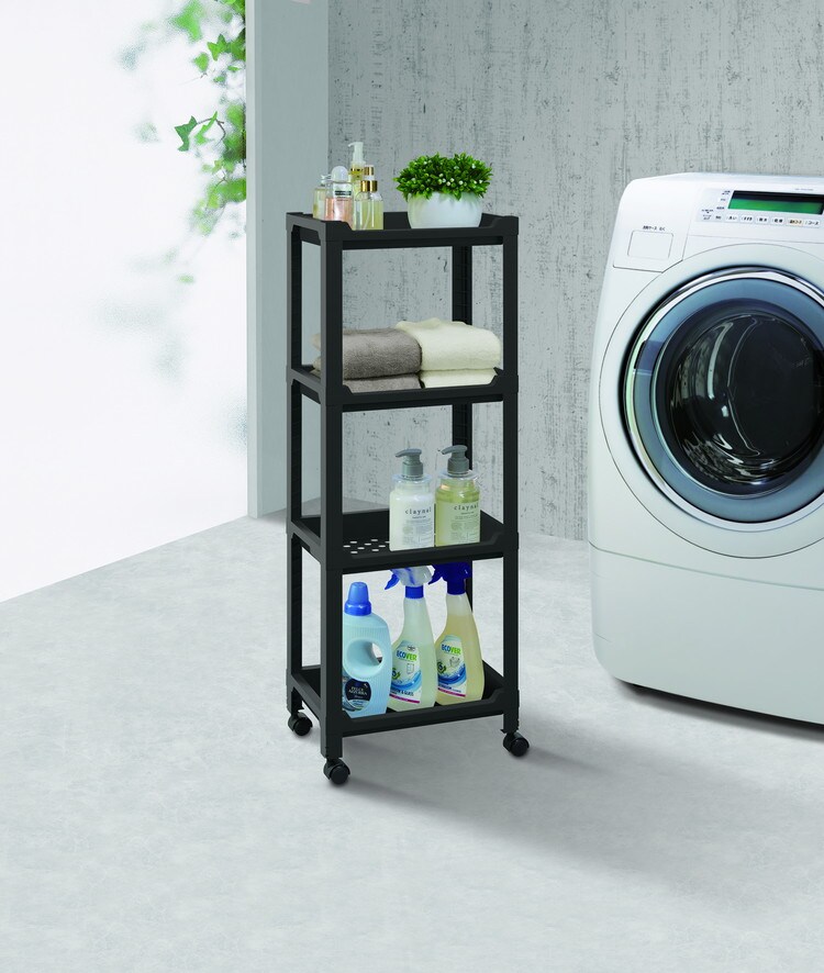 キッチン、ランドリーまわりの収納にちょうどいい天板付きワゴン。使用シーンを選ばない黒色なのでお部屋の雰囲気をこわさない。