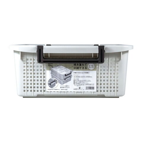 積み重ねできる収納バスケットLS(Lサイズ・浅型)サイズ。取っ手を内側に倒すと積み重ねることができる。重ねてもズレないので安心。使わないときも重ねてまとめられ、場所をとらないので便利。
