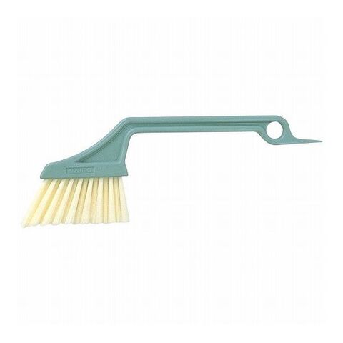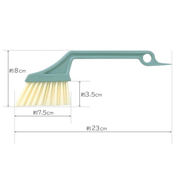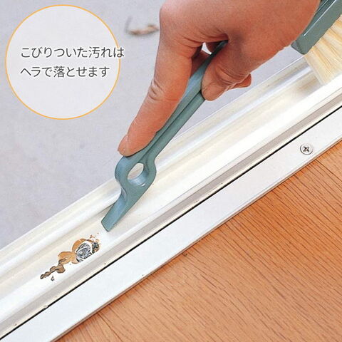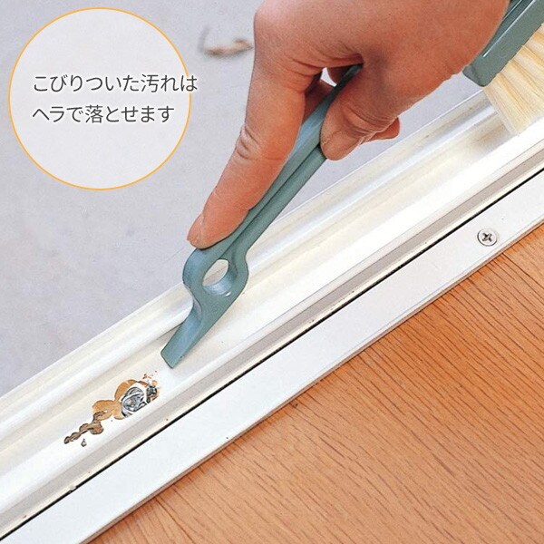 サッシの溝にたまったホコリ取りに便利なブラシ(ほうき)。サッシの狭いレール部分のホコリも掃きだせる。こびりついた汚れも取れるヘラ付き。