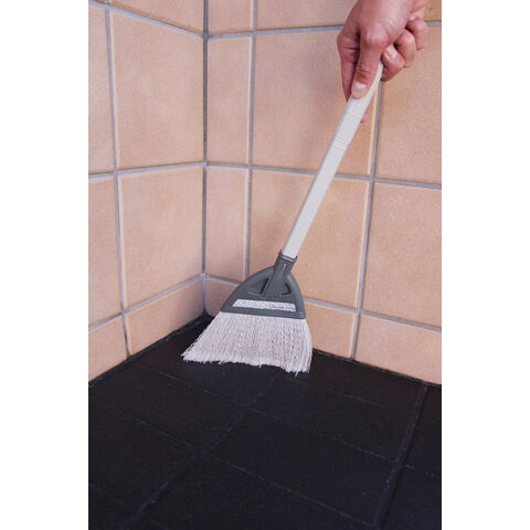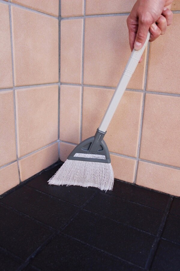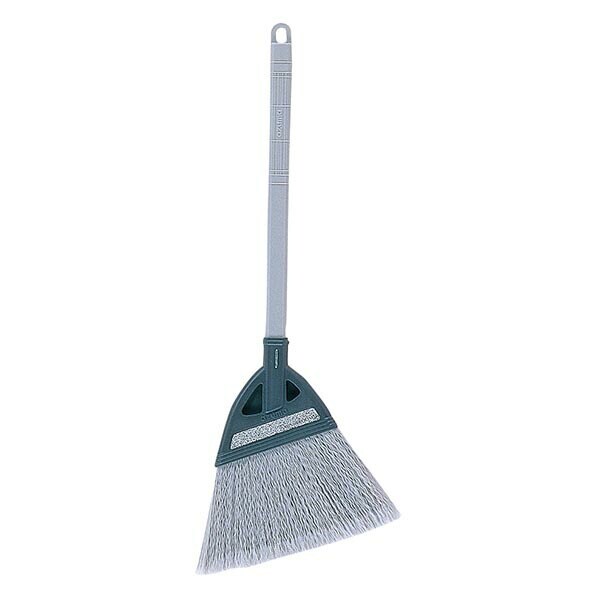 先の割れた穂が密集しているので、細かなゴミも掃き取れるコンパクトなホウキ。穂先がポリプロピレンでできているので、汚れたら水で洗えます。