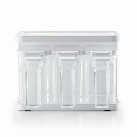 ラックの背面にマグネットがついた調味料ラックと、そこピッタリ収まる密閉調味料ポット(450ml)が3個ついたセット。