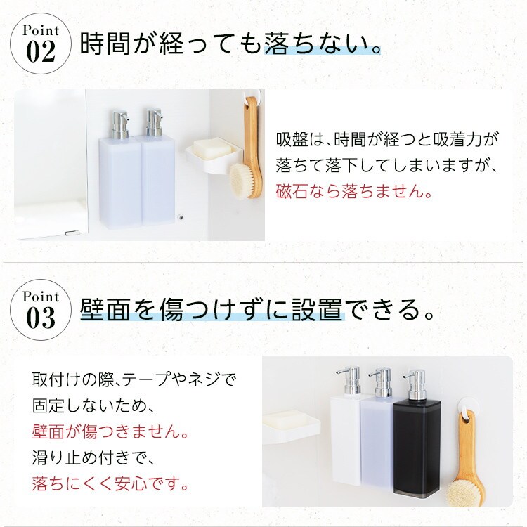 シャンプー、ボディソープ、コンディショナーやリンスなどをこぼしにくいので安心。