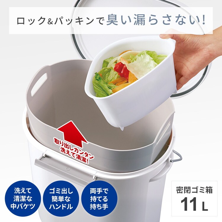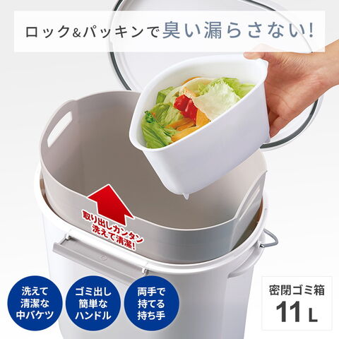 パッキン付き密閉フタにより従来の非密閉タイプに比べ大幅ニオイカット。生ゴミなどの気になるにおいを密閉。洗える中バケツ付き。