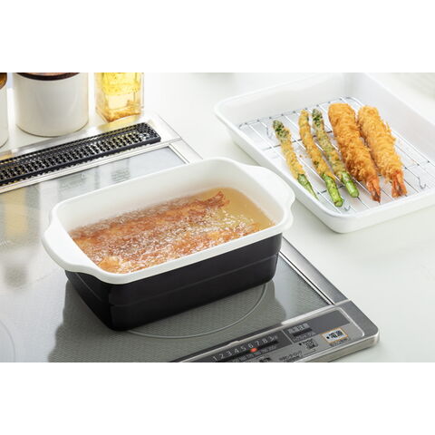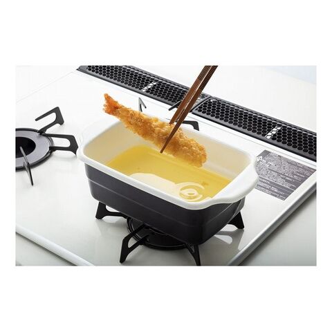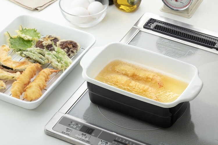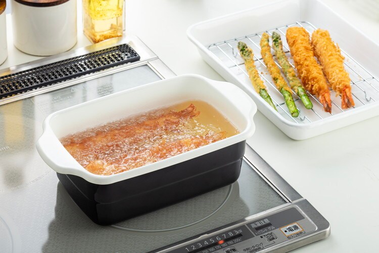 四角いので、収納するときに無駄なスペースをとりません。鍋の角(コーナー)を油の注ぎ口として使えるので、オイルポットへ油を移しやすい。長方形だから、少ない油でもアスパラやエビフライなど、長いものも揚げやすい。