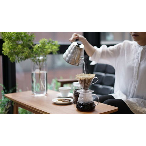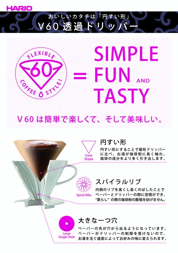 【特徴(1)…円すい形】V型円すい形なので珈琲粉の層が深くでき、珈琲粉に注いだお湯が円すいの頂点に向かって流れるので、珈琲粉と長く触れることになり、豆の旨味や成分をしっかりと抽出できます。【特徴(2)…大きな一つ穴】ドリッパー底面の穴は大きな一つ穴で、注がれたお湯がドリッパーから制限を受けることなく抽出でき、より「ネルドリップ」に近い抽出ができます。お湯を注ぐ速度によりコーヒーの味を変えることができるため、お好みのコーヒーをお楽しみいただけます。