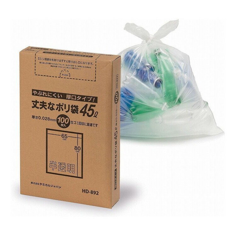 ケミカルジャパン 丈夫な厚口 ポリ袋 45L 半透明 100枚 HD-892【送料無料】