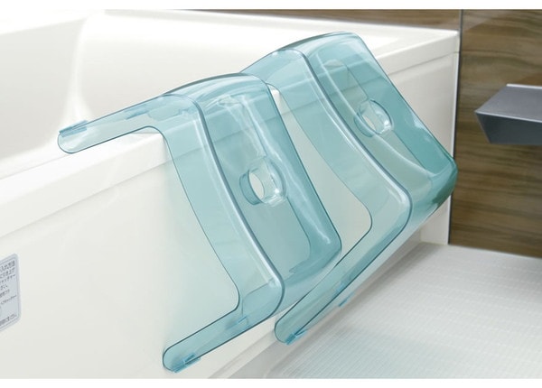 掛けて乾燥・収納できるバスチェア。浴槽のヘリに掛けられます。
