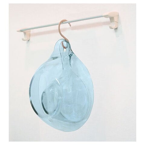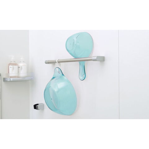 掛けて乾燥・収納できる手おけ。タオルバーに取っ手部分を入れたりS字フックを使って掛けることも可能。