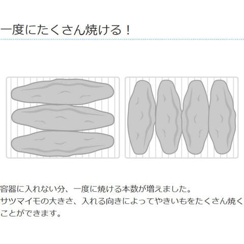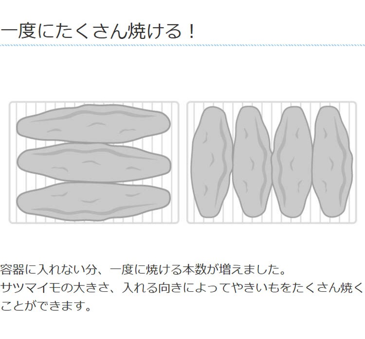 ●容器に入れない分、一度に焼ける本数が増えました。サツマイモの大きさ、入れる向きによってやきいもをたくさん焼くことができます。