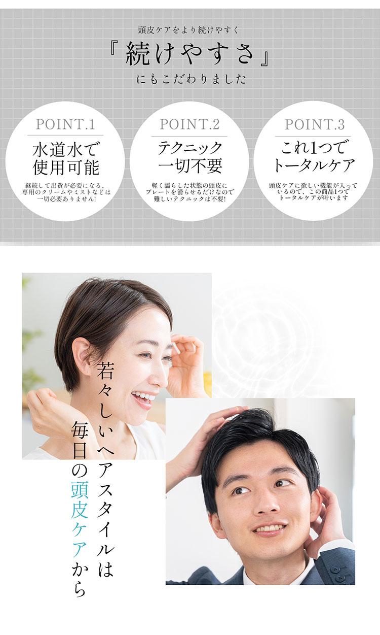 難しいイメージがありがちな頭皮ケアですがこの商品を使えば髪をとかすように頭皮あててスーッと動かすだけ!難しいテクニックは一切不要です!
