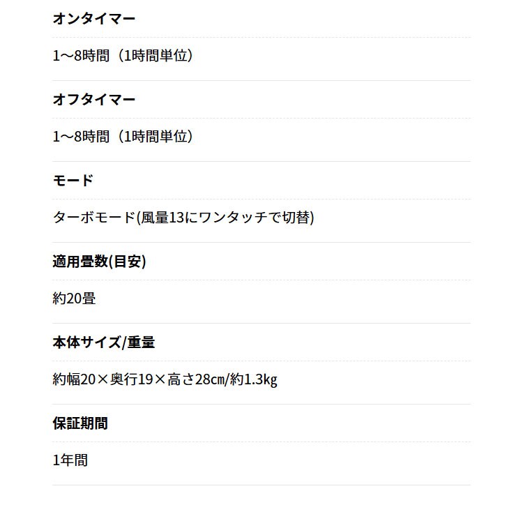 就寝時やお出かけ時に便利なオン/オフタイマー機能を搭載。1~8時間の間で1時間ごとに設定が可能で、電源の切り忘れ防止にも役立ちます。