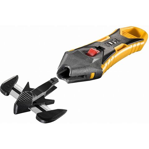 ハードな現場でも使える、刃に指が触れにくい安心設計の替刃式開梱用カッターです。