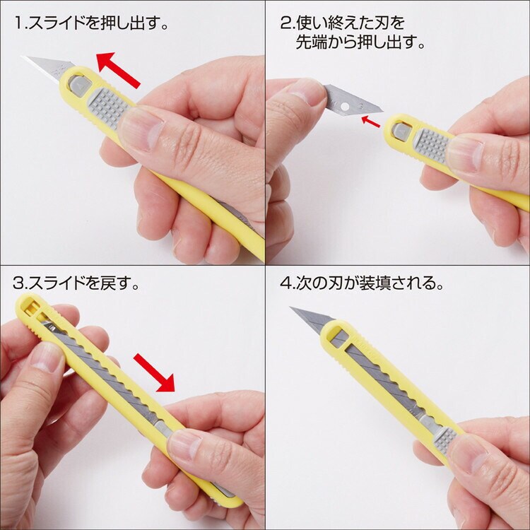 使用時は安全保護メガネをご使用ください。刃をホルダーに残したままマガジンを抜かないでください。水気・酸気・粘性のあるものを切断した時は、刃をきれいにふきとるか、新しい刃と交換してください。