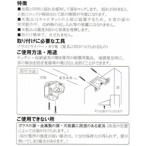用途:キッチンや収納家具の開き扉用耐震用製品(扉開き防止・食器の飛び出し防止)